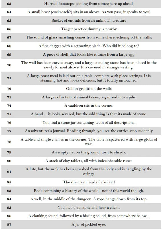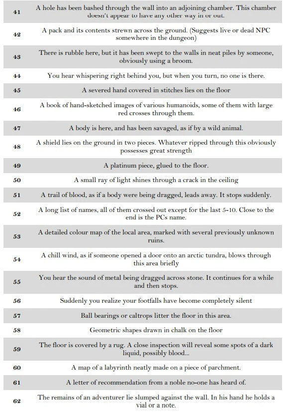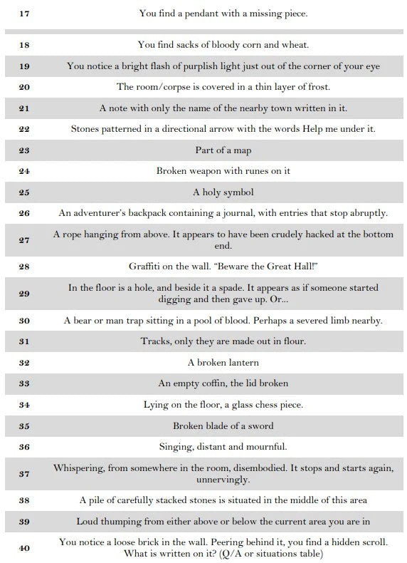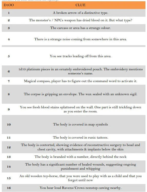 After defeating a monster, or discovering a corpse, clues may be found. Use these clues to form the story of your adventure. “How can I provide clues when I don’t know the answer to the mystery?” Answer: The clues determine the mystery.